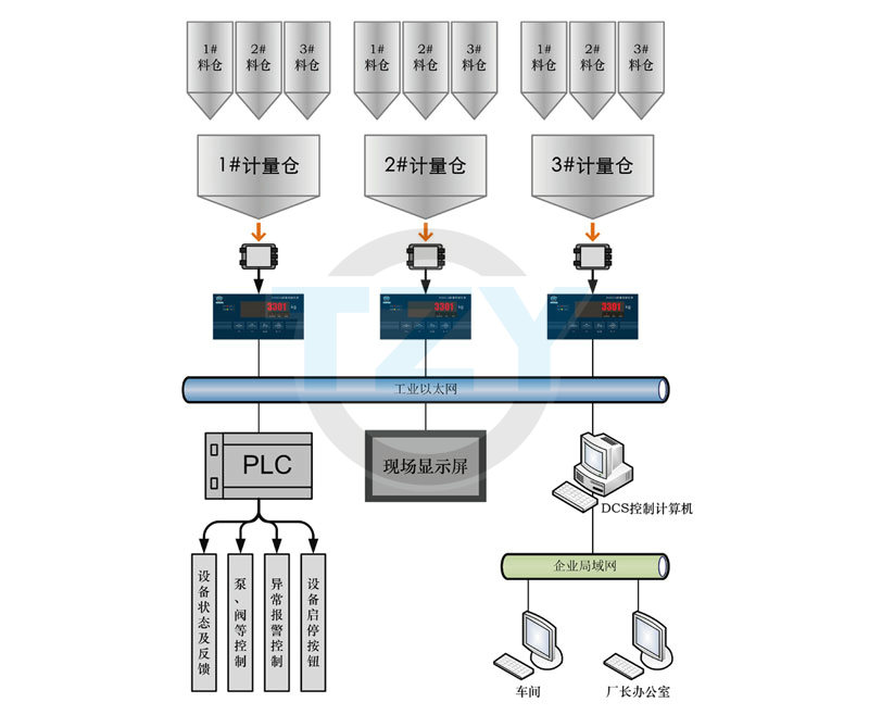 配料系统是一种自动定量计量设备,其功能就是将多种物料按设定重量分别加入反应釜中,进行生产监测和控制。该产品采用本公司自主开发的称重控制技术,具有高精度、高速度及长期工作可靠性好等特点。所以该称重控制系统具有较高的自动化程度,最大程度地防止物料本身对环境的污染,从而对操作人员进行有效地劳动保护。整个配料过程均在系统的控制下自动完成,对于各工作状态的监控及配方数据的输入可通过合适的人机界面完成,如触摸屏、PC上位机等。该系统特点是:人机界面友好、工作数据及配方数据集中管理、维护方便。